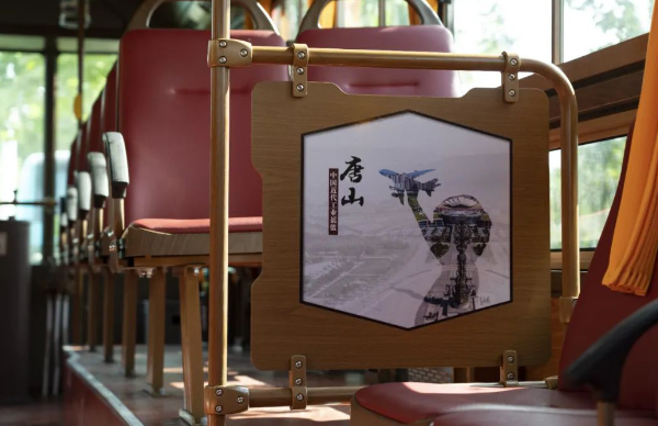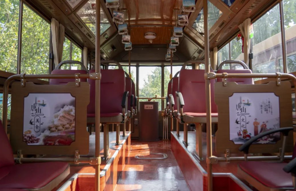 車身外形與眾不同,車內文化也極具特色。交發集團以“一車一主題”為原則,打造了工業歷史、旅游景點、特色美食、戲曲文化等多個主題文化車廂。利用燈箱、擋板、拉手等車內設施,以圖文并茂的形式介紹唐山文化,串起唐山百余年發展的歷史脈絡。鐺鐺車成為了傳遞歷史文化的“流動課堂”,整個車廂營造出濃厚的特色文化氛圍。